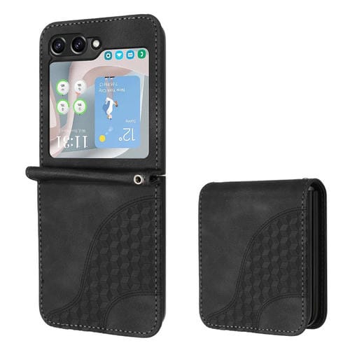 Funda para Samsung Galaxy Z Flip5 5G Yx0060 Cuero con Relieve y Cabeza de Elefante con Cordón (Negro)