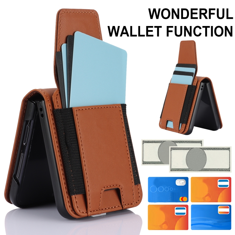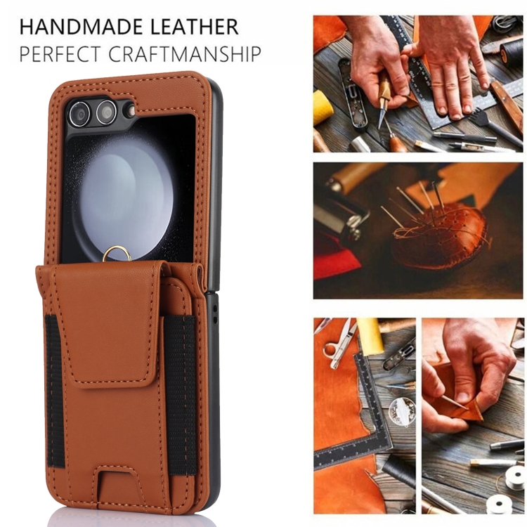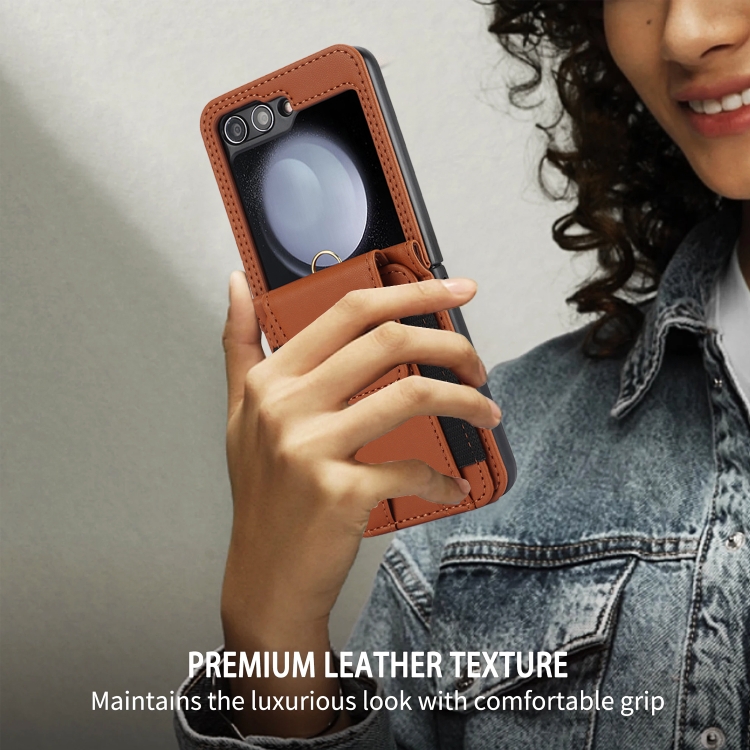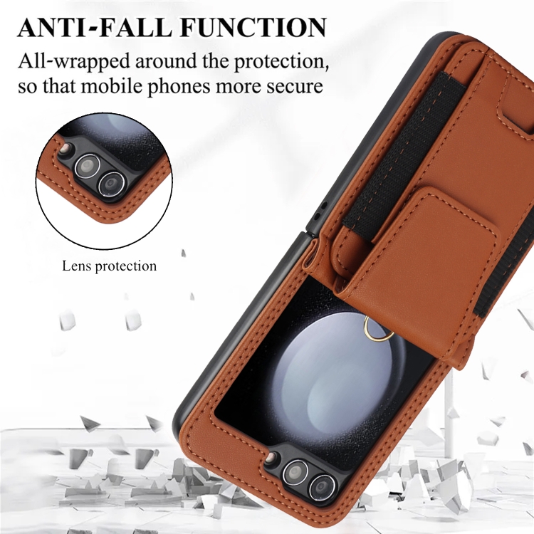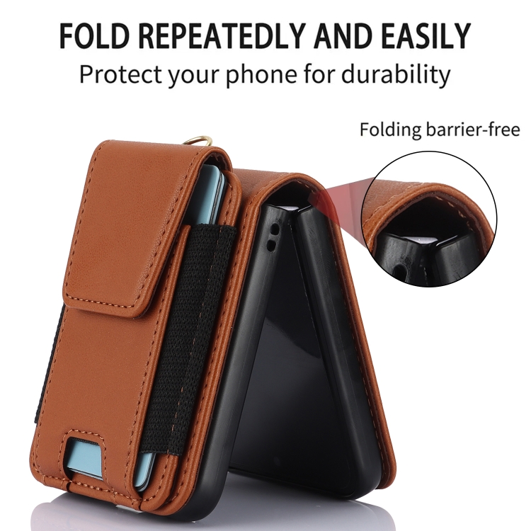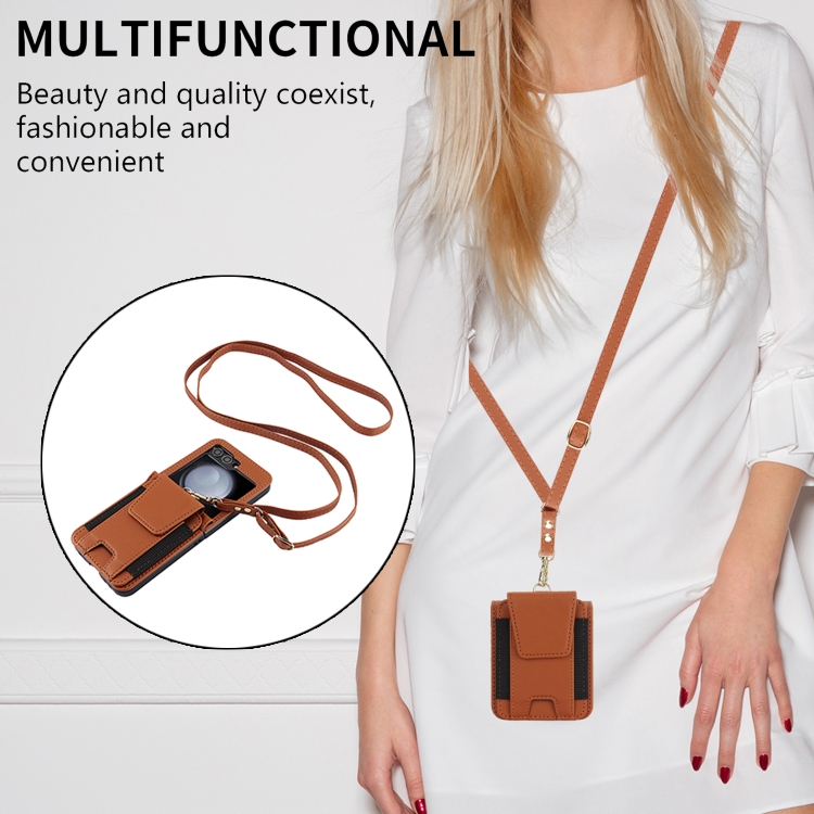 Funda para Teléfono Plegable Samsung Galaxy Z Flip5 con Ranuras para Tarjetas y Cordón Largo (Marrón)