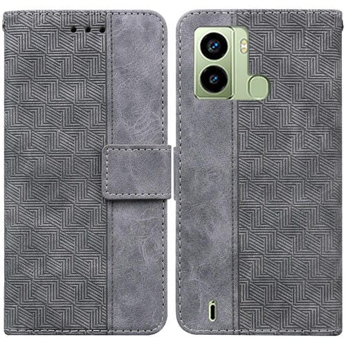 Funda Flip de Cuero para Tecno Pop 6 con Sensor de Huella y Relieve Geométrico (Gris)