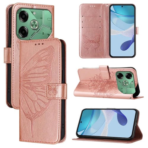 Funda de Cuero para Tecno Pova 6 con Mariposa en Relieve (Oro Rosa)