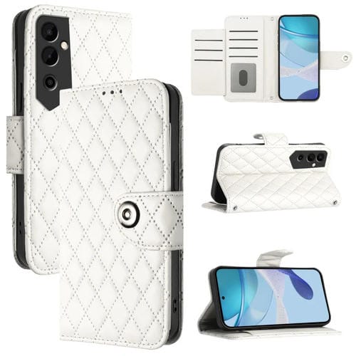 Funda de Cuero para Tecno Pova Neo 2 con Tapa Textura Rombal y Cordón (Blanco)