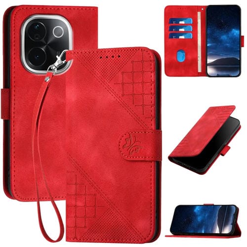 Para Vivo Iqoo Z9S Pro / T3 Pro 5G India Yx0080 Funda de Cuero con Tapa y Patrón En Relieve de Mariposa y Cuadrícula con Cordón (Rojo)