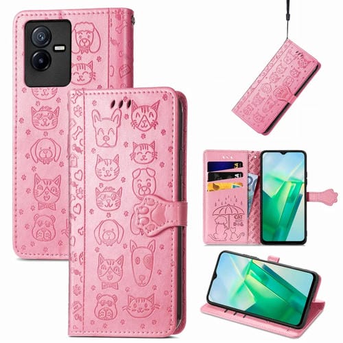 Para Vivo T2X Cute Cat And Dog Estuche de Cuero En Relieve para Teléfono (Rosa)