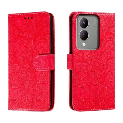 Para Vivo Y17S Funda para Teléfono de Cuero con Tapa y Estampado de Flores de Encaje (Rojo)