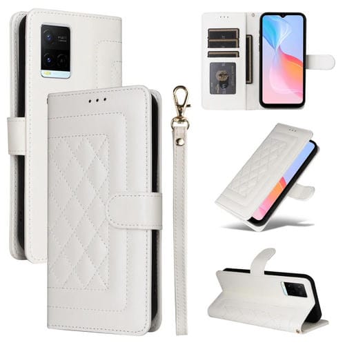 Para Vivo Y21 / Y33S Funda para Teléfono con Tapa de Cuero Diamond Lattice (Blanco)