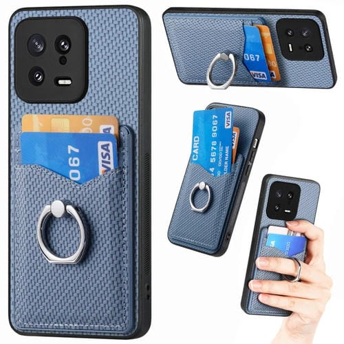 Para Xiaomi 13 Carbon Fiber Card Wallet Ring Holder Phone Case (Azul)