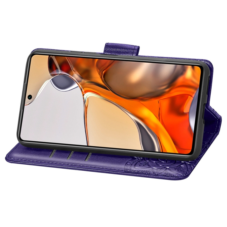 Para Xiaomi Mi 11T / 11T Pro Butterfly Love Flowers En Relieve Funda de Cuero de Flip Horizontal con Soporte y Ranuras para Tarjetas y Billetera y Cordón (Morado Oscuro)