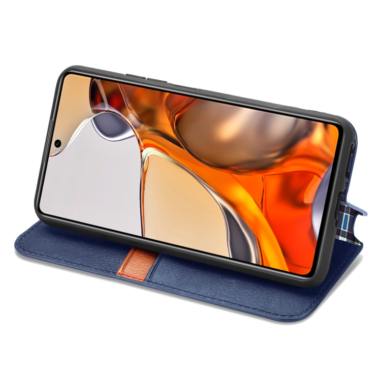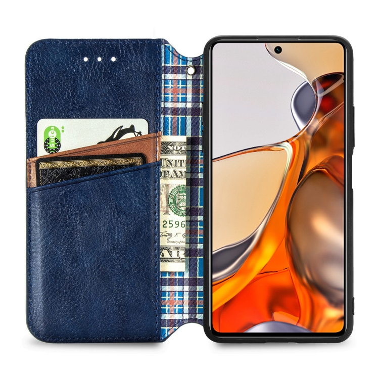 Para Xiaomi Mi 11T / Mi 11T Funda de Cuero Magnética de la Rejilla Horizontal Prensada con El Soporte y Las Ranuras y la Cartera (Azul)