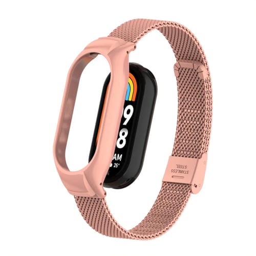 Caja de Metal Integrada y Correa de Reloj con Hebilla de Malla de Acero para Xiaomi Mi Band 8 (Rosa Brillante)