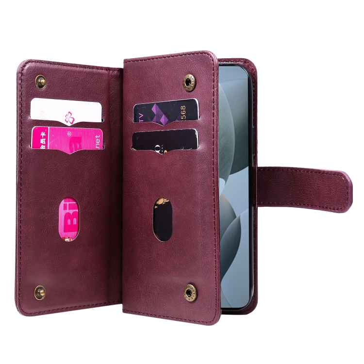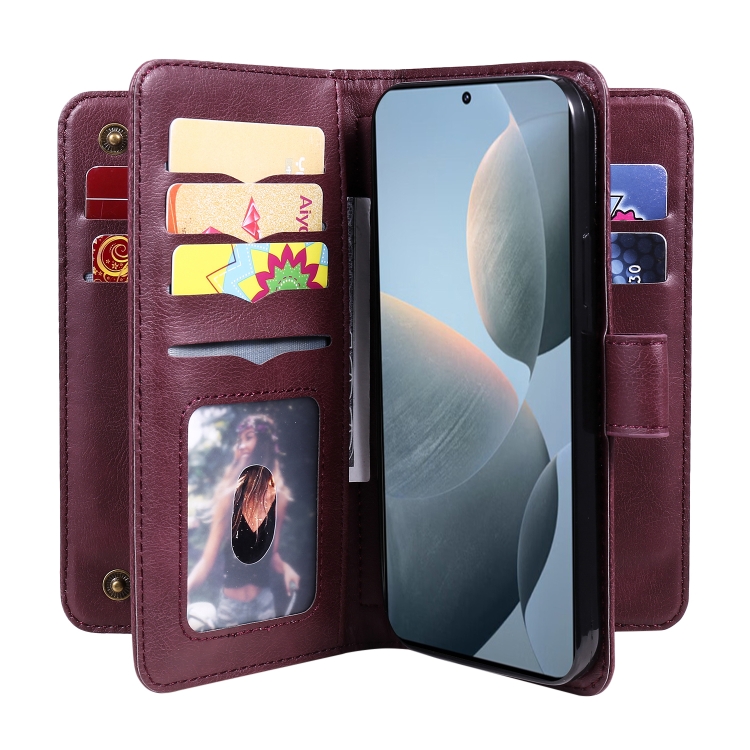 Para Xiaomi Poco F6 Pro Cartera Multifunción 10 Ranuras para Tarjetas Funda de Cuero para Teléfono (Clarete)