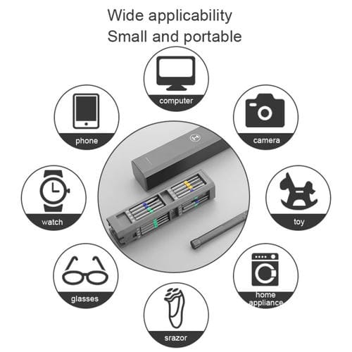 El Set de Herramientas Verdeer Screw Knife Disassembling Maintenance, Serie 30 en 1, con barril de aluminio, es un Juego profesional diseñado para facilitar tareas de desmontaje y mantenimiento en una amplia variedad de dispositivos. Este kit es compatible con equipos como Computadoras, Cámaras, juguetes, electrodomésticos, afeitadoras, gafas, Relojes y Teléfonos Móviles. Su función principal es proporcionar una solución Completa y compacta para usuarios que reparan por cuenta propia, permitiendo un manejo eficiente y seguro gracias a su diseño ergonómico y materiales de alta calidad. La inclusión de una punta con imán fuerte facilita la manipulación de tornillos pequeños, mientras que el almacenamiento integrado en el mango optimiza la organización de las Piezas.