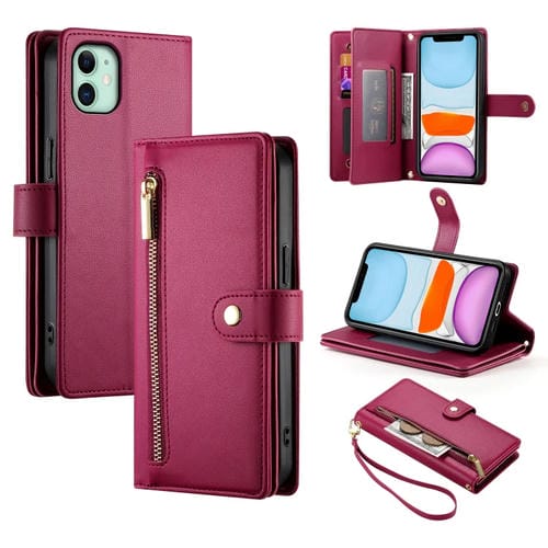 Funda de Cuero para iPhone 11 con Nueve Ranuras para Tarjetas y Cremallera (Rojo)