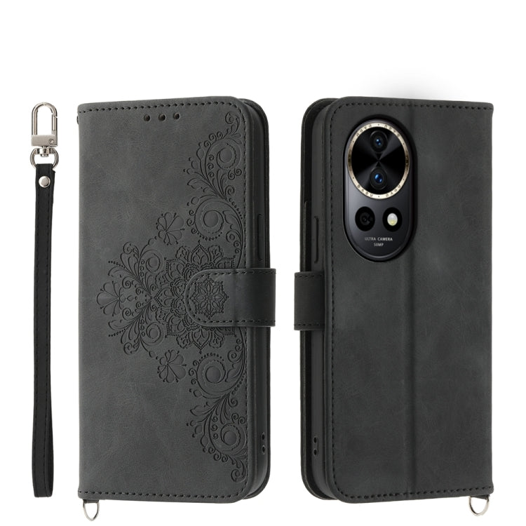 Funda de Cuero para Huawei Nova 12 Pro con Billetera en Relieve y Flores (Negro)