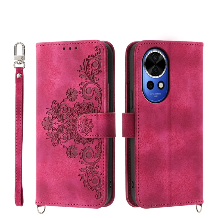 Funda de Cuero para Huawei Nova 12 con Billetera en Relieve y Flores (Rojo Vino)