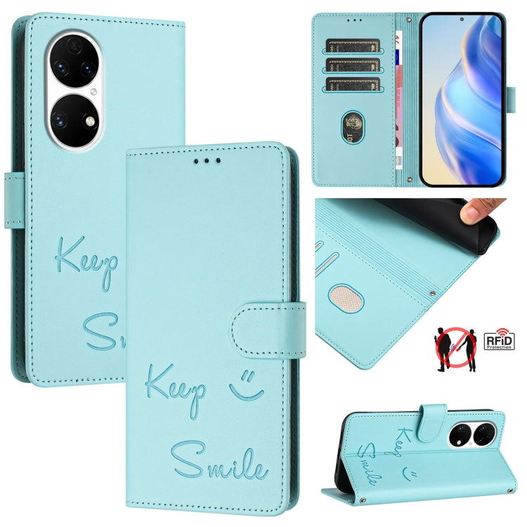Funda de Cuero Rfid con Relieve Sonriente para Huawei P50 Pro (Verde Menta)
