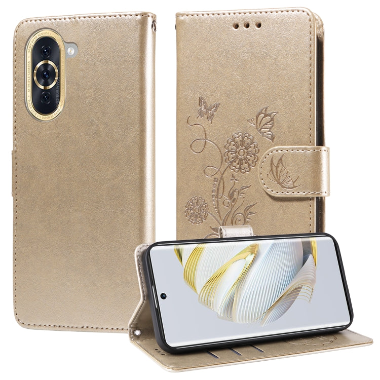 Funda de Cuero Huawei Nova 10 con Diseño de Mariposas y Flores en Relieve (Dorada)