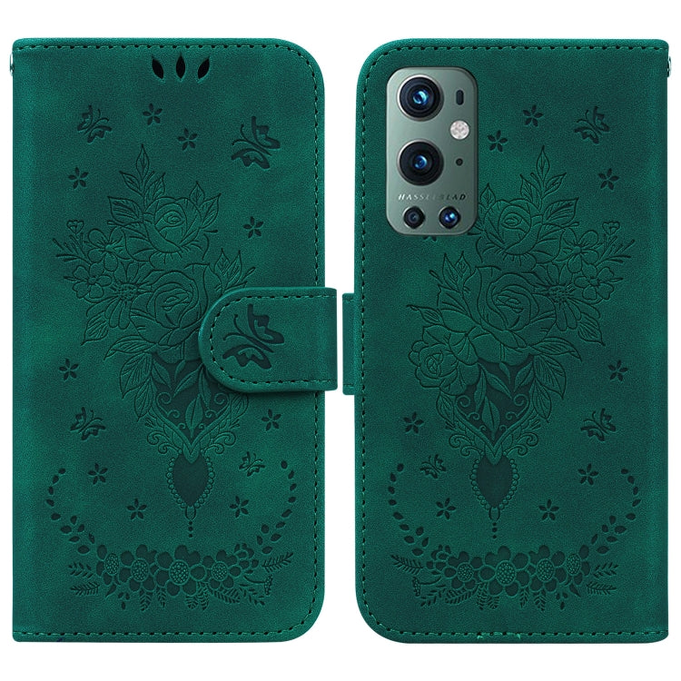 Funda para OnePlus 9 Pro Butterfly Rose Foothip en Relieve de Cuero (Verde)
