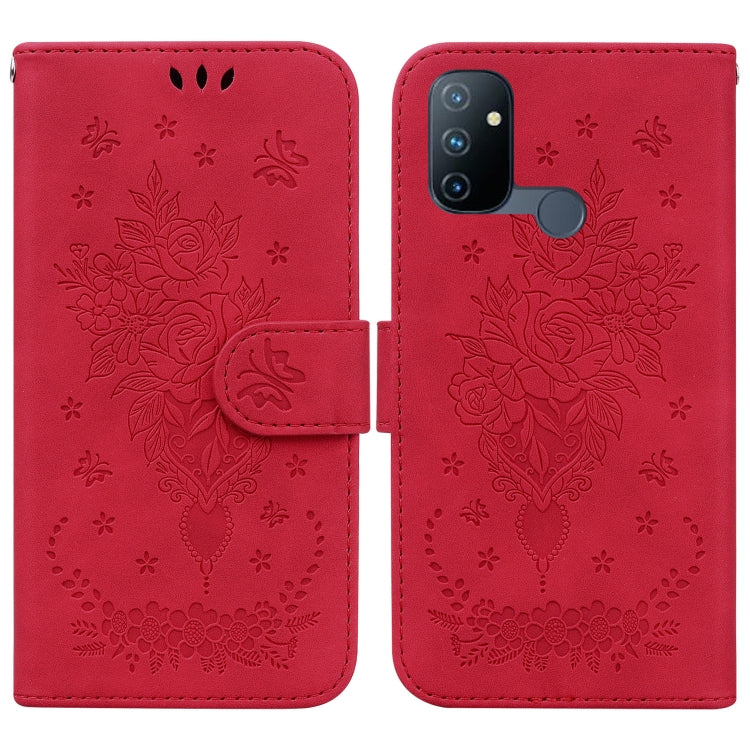 Funda para OnePlus Nord N100 Butterfly Rose Foothip en Relieve de Cuero (Rojo)