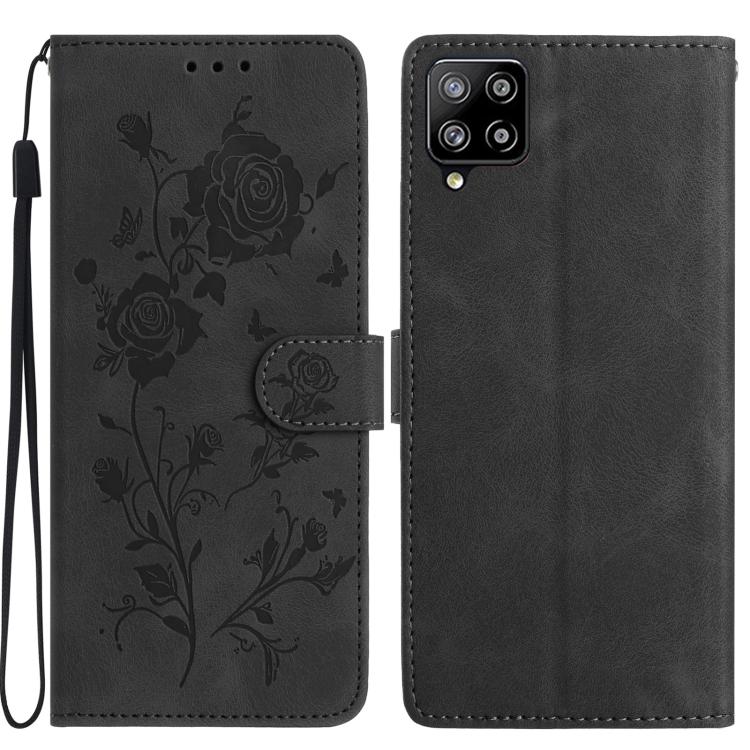 Funda de cuero con estampado de rosas en relieve para Samsung Galaxy A42 (negra)