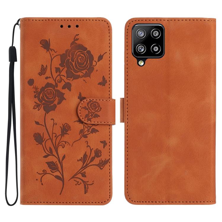 Funda de cuero con estampado de rosas en relieve para Samsung Galaxy A12 (marrón)