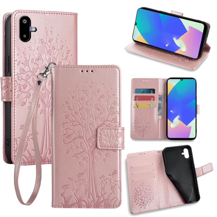 Funda de piel con relieve de árbol y ciervo para Samsung Galaxy F06 5G (oro rosa)
