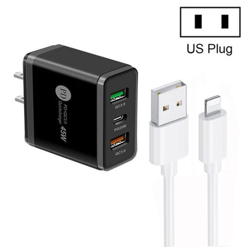 Cargador Usb Multipuerto 45W Pd25W + 2 X Qc3.0 con Cable Usb A 8 Pines (Negro)
