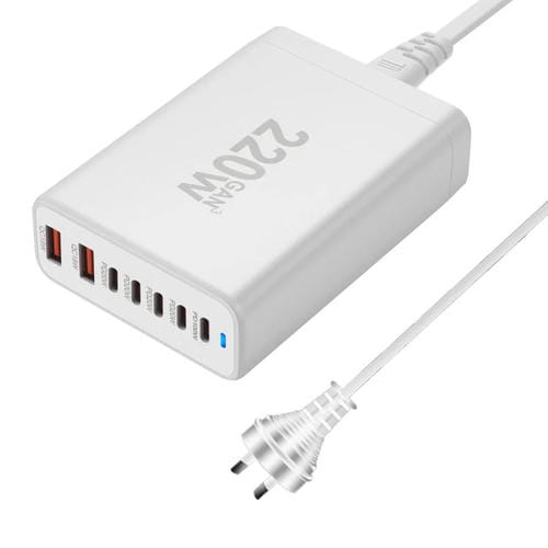 Cargador rápido Gan 220W Usb 2 puertos Usb-C 5 puertos Enchufe Au (Blanco)