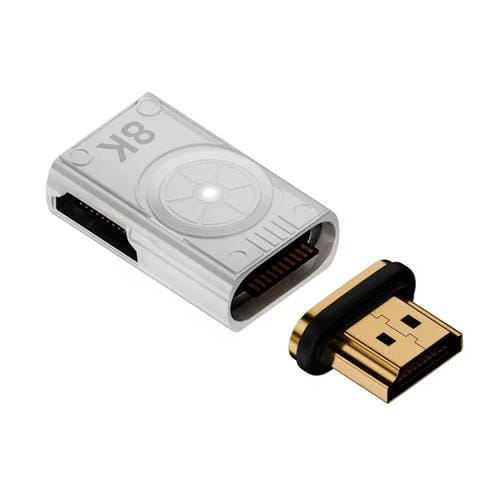 El convertidor magnético de curvatura lateral HDTV a HDTV 8K 60Hz (Curva Derecha Plateada) es un dispositivo especializado diseñado para la transmisión de vídeo con alta resolución y calidad. Compatible con la versión HDTV 2.1, este convertidor permite la Conexión eficiente entre dispositivos como decodificadores, consolas de Juegos, Computadoras y monitores, televisores o proyectores de Pantalla grande. Su función principal es garantizar una calidad de imagen ultra clara en resoluciones de hasta 8K a 60Hz y 4K a 120Hz, ajustándose automáticamente a la resolución óptima del dispositivo conectado. Su diseño compacto y ligero facilita su transporte y uso en diferentes entornos, mientras que su interfaz magnética con fuerte succión proporciona una Conexión segura y estable. Además, incorpora una luz indicadora que permite visualizar el estado de funcionamiento de manera inmediata.