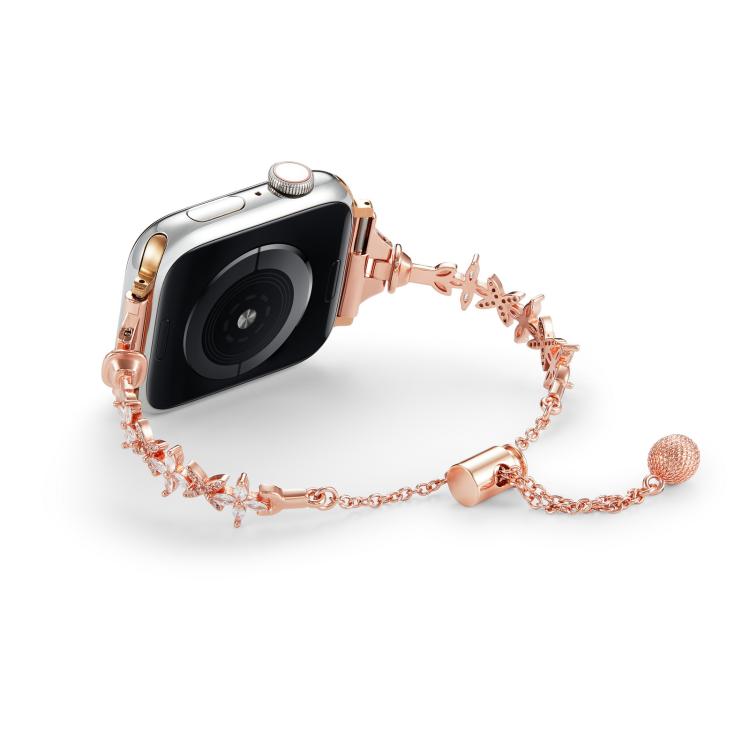 Correa de aleación de zinc con diamantes y trébol de cuatro hojas para Apple Watch de 42 mm, 41 mm, 40 mm y 38 mm (oro rosa)