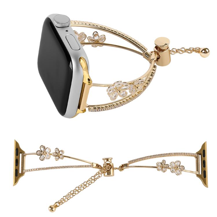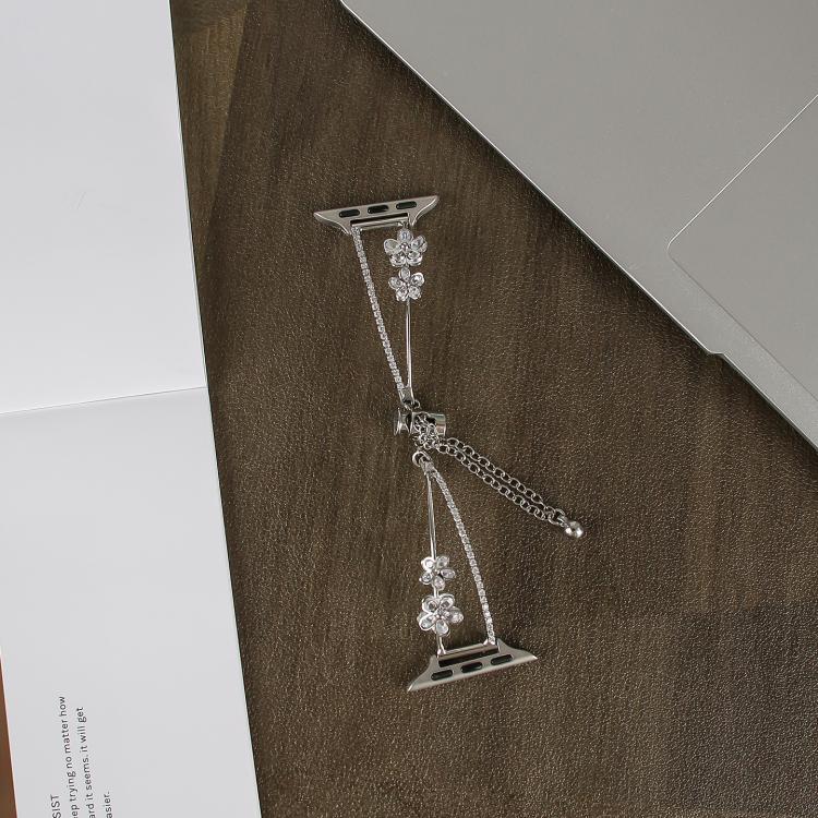 Correa de reloj con flor de cinco pétalos y circonitas incrustadas de cobre para Apple Watch de 46 mm, 49 mm, 45 mm y 44 mm (plateada)