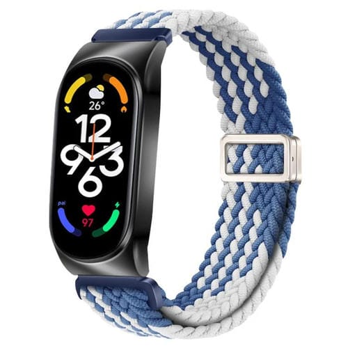 Correa de reloj elástica de nailon trenzado con hebilla magnética y marco de metal para Xiaomi Mi Band 6/5/4/3 (azul y blanco)