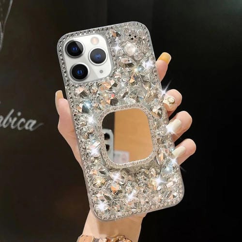 Estuche para Teléfono iPhone 11 Pro con Espejo y Diamantes de Imitación Hecho a Mano (Cuadrado Gris Plateado)
