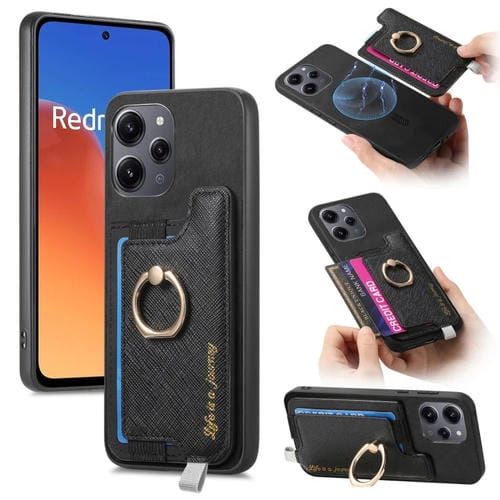 Para Redmi 12 / Note 12R / Poco M6 Pro 5G Funda de Teléfono con Soporte para Tarjeta y Anillo de Cuero con Diseño Retro Magsafe Cross (Negro)