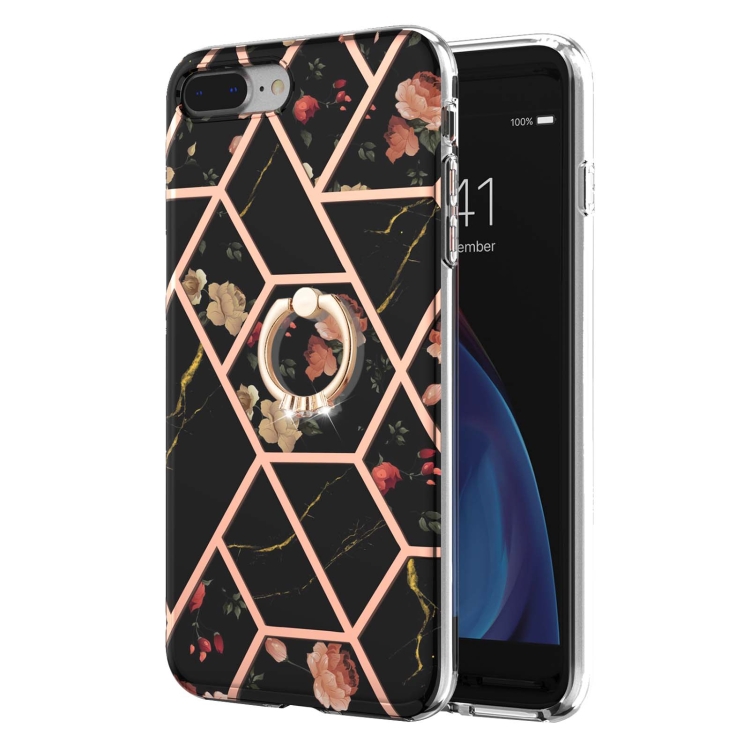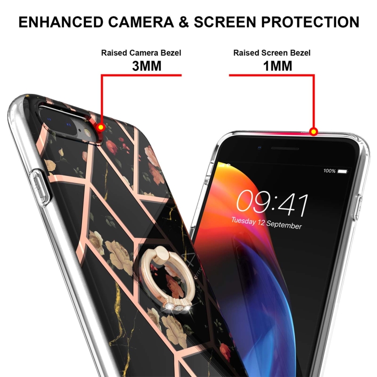 Funda para iPhone 7 Plus 8 Plus a Prueba de Choques con Flores Mármol Empalme y Soporte Anillo Diamantes (Flor Negra)