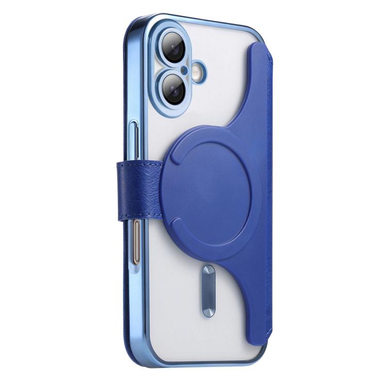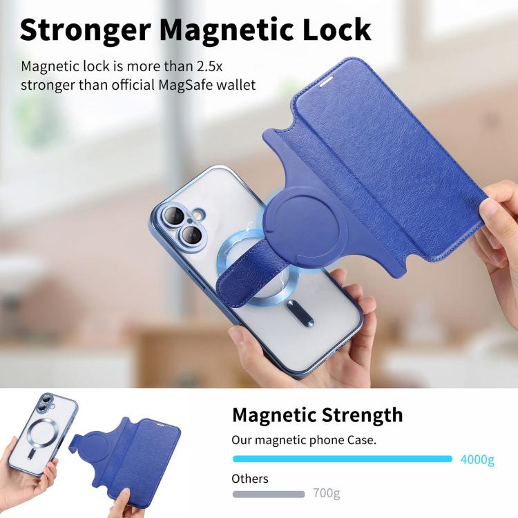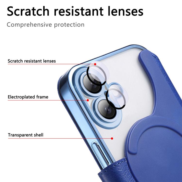 Funda de cuero antirrobo MagSafe RFID galvanizada divisible para iPhone 17 con protector de lente (azul)