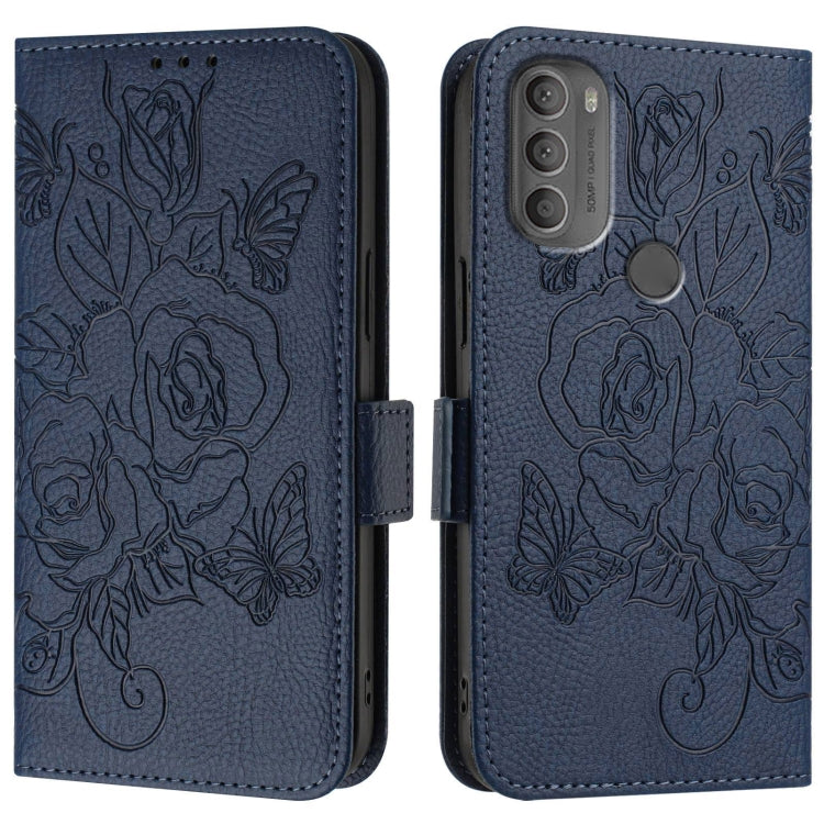 Funda de Cuero Antirrobo RFID con Relieve para Motorola Moto G71 (Azul Oscuro)