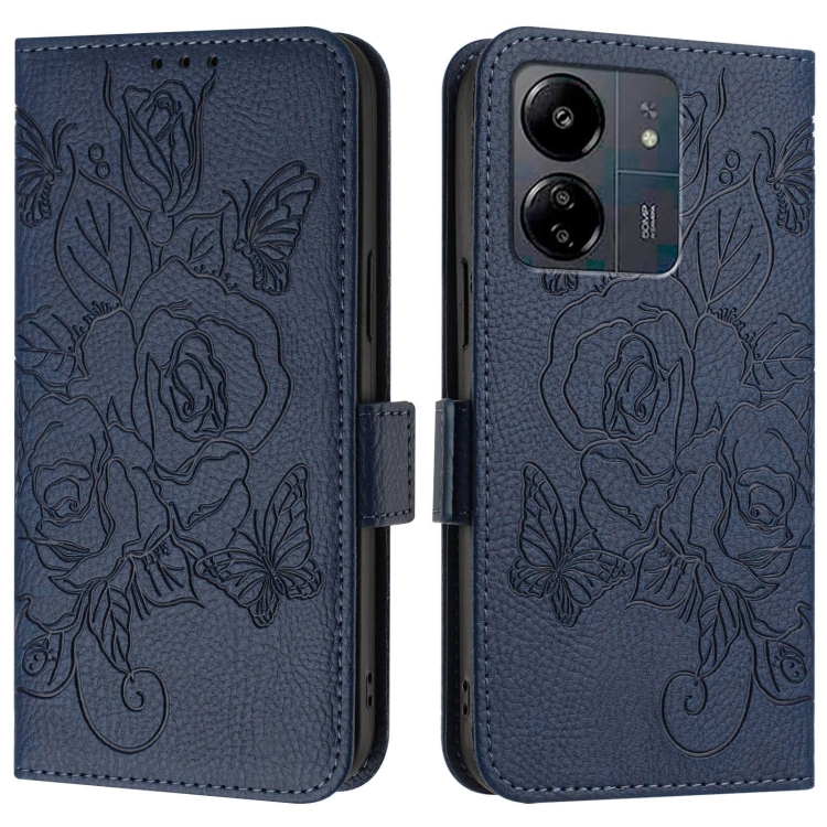 Funda de Cuero Antirrobo Rfid con Relieve Rosa para Redmi 13C 4G Global / Xiaomi Poco C65 (Azul Oscuro)