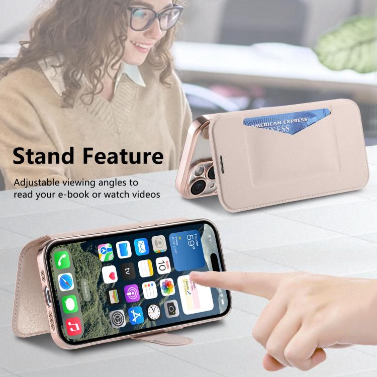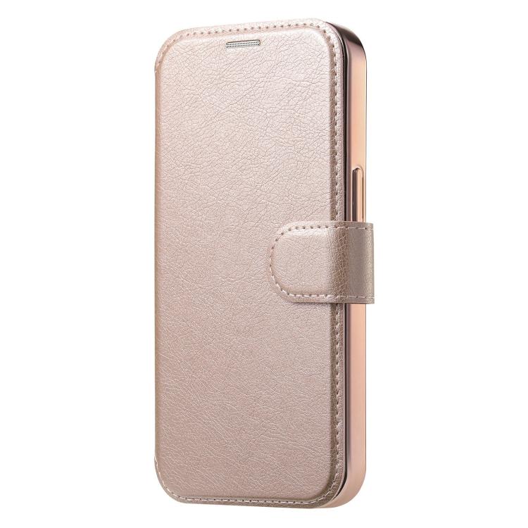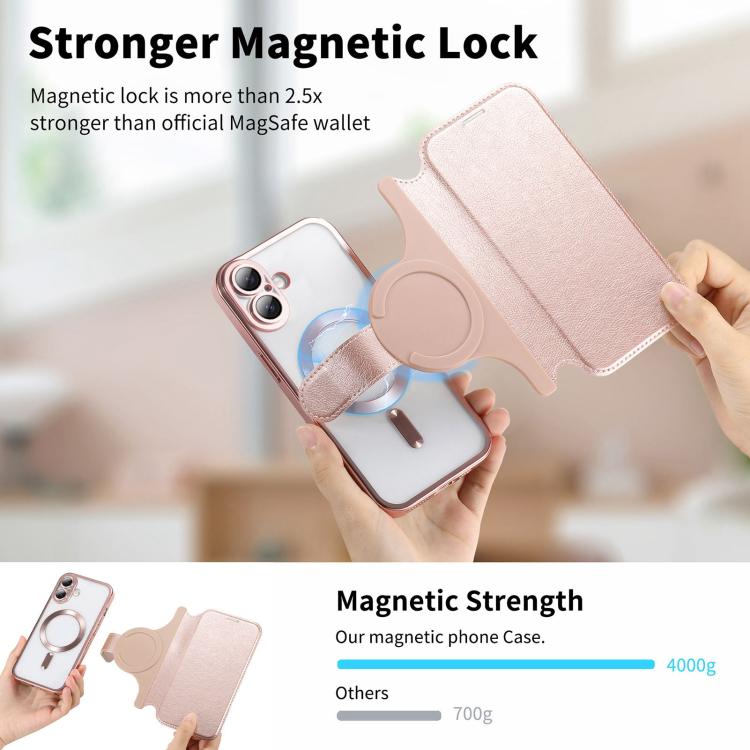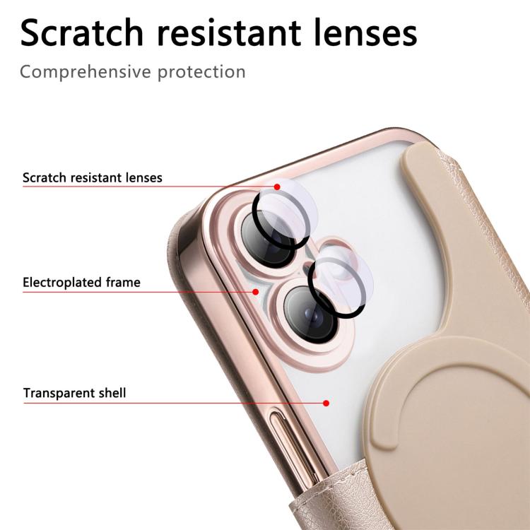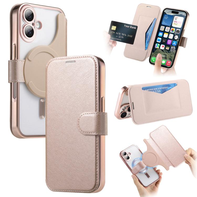 Funda de cuero antirrobo RFID MagSafe galvanizada divisible para iPhone 17 con protector de lente (oro rosa)