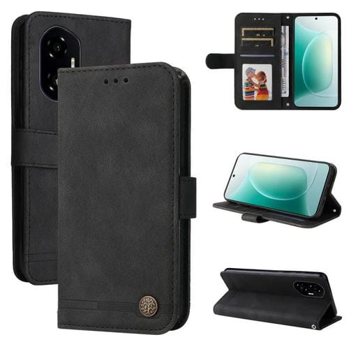 Funda de Cuero para Honor 300 con Botones de Metal y Diseño Árbol de la Vida (Negro)
