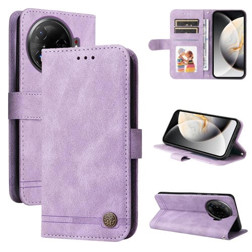 Funda de Cuero para Tecno Camon 30 Pro con Botones de Metal y Diseño Árbol de la Vida (Morado)