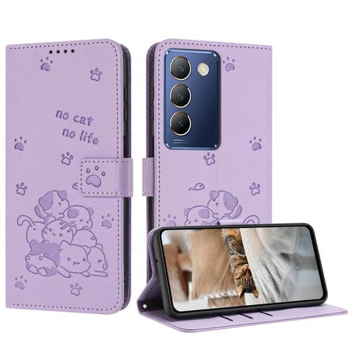 Funda de Cuero con Estampado de Gatito y Cordón para Vivo Y100 Idn / Y200E 5G (Morado)