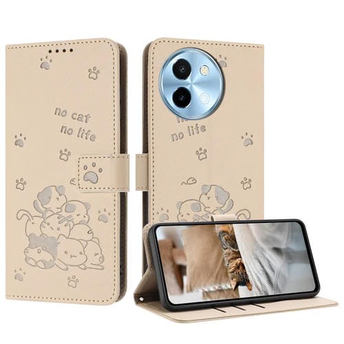 Funda de Piel con Estampado de Gatito y Cordón para Vivo Y38 5G (Beige)