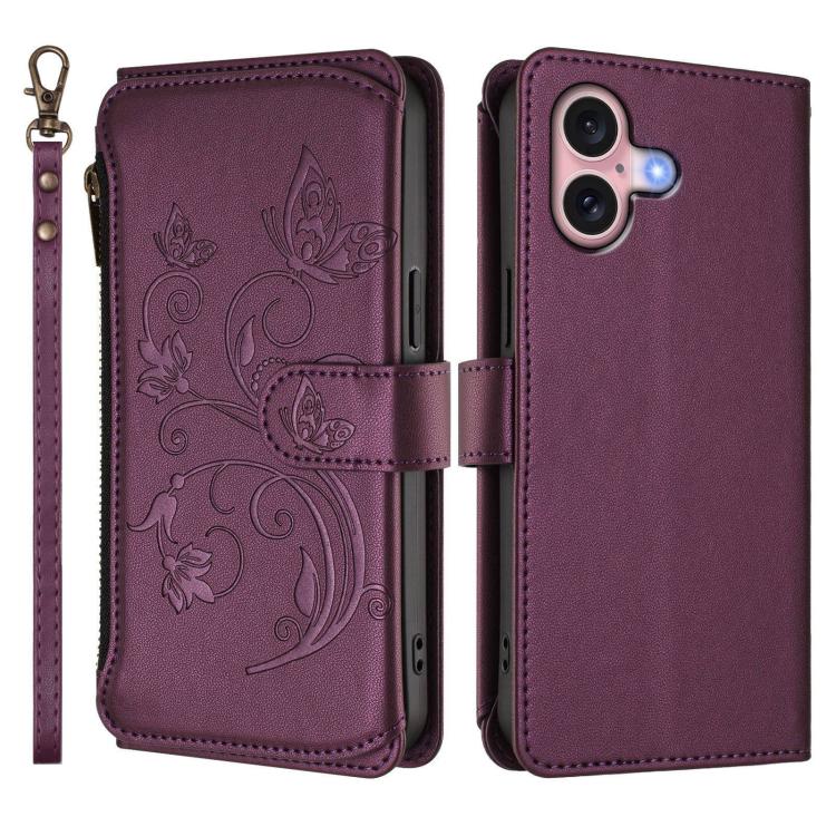 Funda de cuero con cremallera para iPhone 16, diseño de mariposas, flores y amor (morado oscuro)