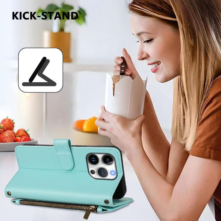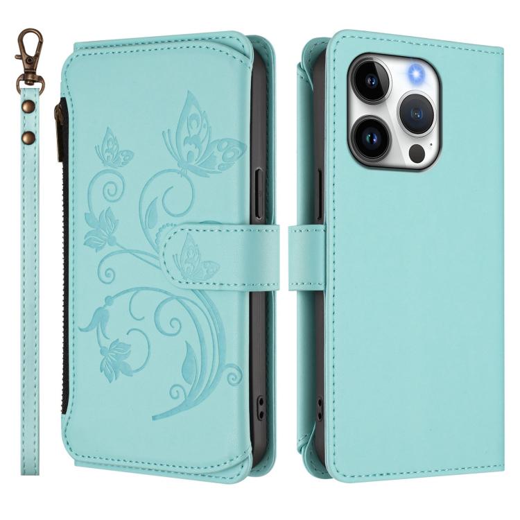 Funda de cuero con cremallera para iPhone 16 Pro, diseño de mariposas, flores y amor (verde menta)