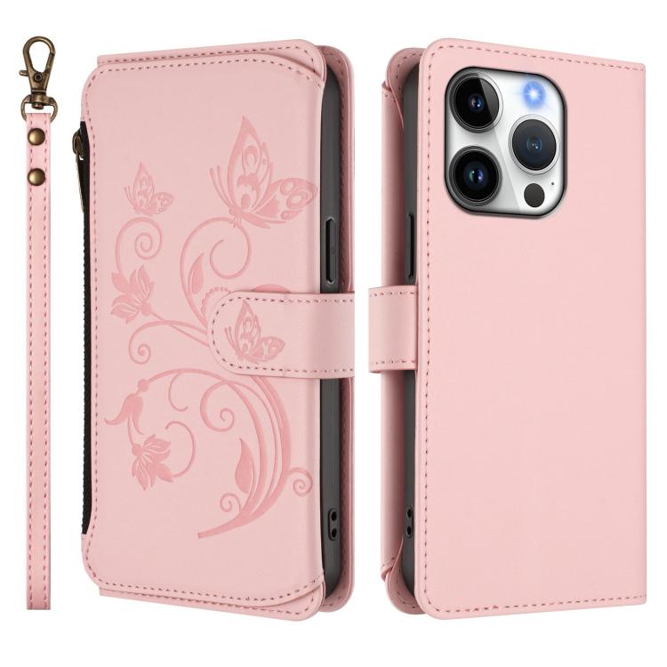 Funda de cuero con cremallera para iPhone 16 Pro Max, diseño de mariposas, flores y amor (rosa)