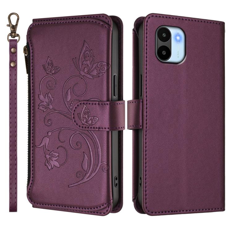 Funda de cuero con cremallera para Redmi A1/Redmi A2, diseño de mariposas, flores y mariposas (morado oscuro)