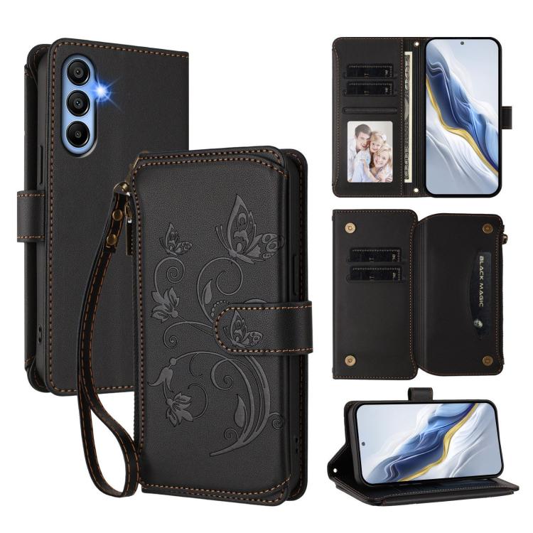 Funda de cuero con cremallera para Samsung Galaxy A15 4G/5G, diseño de mariposas, flores y amor, con múltiples tarjetas (negro)