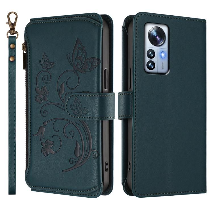 Funda de cuero con cremallera para Xiaomi 12 Pro / 12S Pro, diseño de mariposas, flores y múltiples tarjetas (verde oscuro)