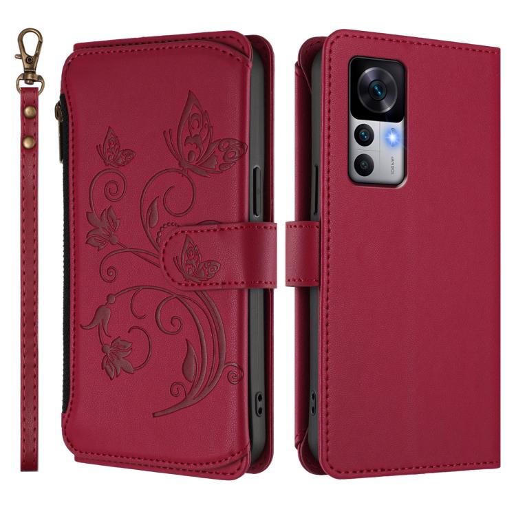 Funda de cuero con cremallera para Xiaomi 12T / 12T Pro / Redmi K50 Ultra, diseño de mariposas, flores y amor (rojo vino)