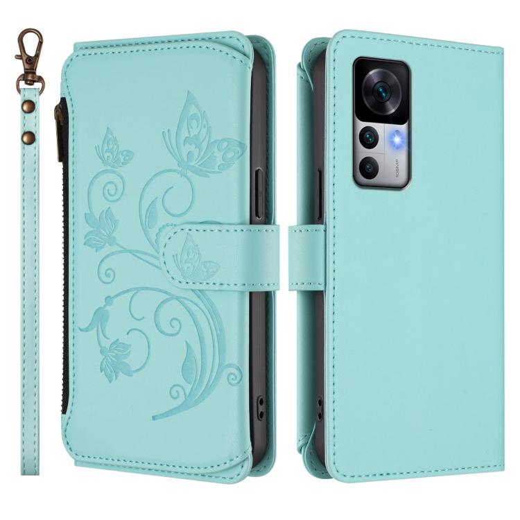 Funda de cuero con cremallera para Xiaomi 12T / 12T Pro / Redmi K50 Ultra, diseño de mariposas, flores y mariposas (verde menta)